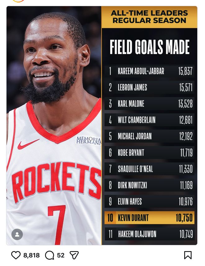 杜蘭特總進球數(shù)超奧拉朱旺升入歷史第十。