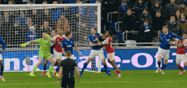 下半場開始后,埃弗頓繼續(xù)祭出三板斧,阿森納也以快制快,第50分鐘,薩卡禁區(qū)內(nèi)的推射已經(jīng)令皮克福德無計可施,防守球員完成關(guān)鍵解圍。