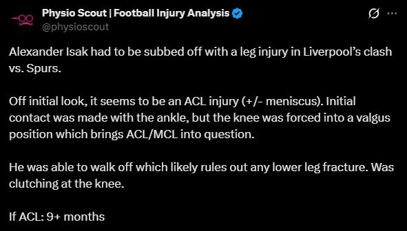 賽后,知名足球傷病分析博主Physio Scout在社交媒體上對伊薩克的傷情進行了初步分析。他寫道:“在利物浦對陣熱刺的比賽中,亞歷山大·伊薩克因腿傷被換下。 初步判斷,似乎是前交叉韌帶(ACL)損傷(+/-半月板損傷)。最初是腳踝受傷,但膝蓋被迫外翻,這使得前交叉韌帶/內(nèi)側(cè)副韌帶(MCL)損傷的可能性變得難以確定。 他能夠自行離開,這很可能排除了小腿骨折的可能性。他當時一直捂著膝蓋。 如果是前交叉韌帶損傷:9個月以上?!?/p>