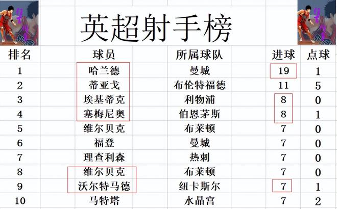 射手榜方面,哈蘭德今天打入2球,在射手榜上是一騎絕塵而去,19球高居榜首,領(lǐng)先第2的蒂亞戈8球。?;倏耍纺釆W齊破門,8球并列第3。沃爾特馬德梅開二度,追上福登,理查利森等人,將前十門檻提高到7球。