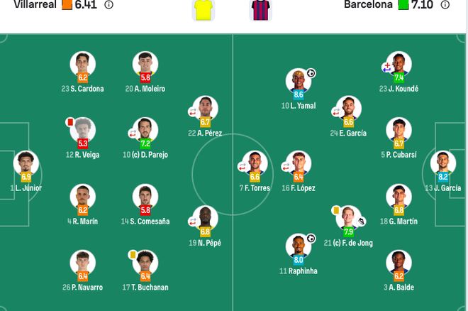 巴薩首發(fā):13-霍安·加西亞、3-巴爾德、5-庫巴西、18-赫拉德·馬丁、23-孔德(78’17-卡薩多)、24-埃里克·加西亞(66’22-伯納爾)、16-費(fèi)爾明(62’14-拉什福德)、21-德容、7-費(fèi)蘭(62’9-萊萬)、10-亞馬爾、11-拉菲尼亞。