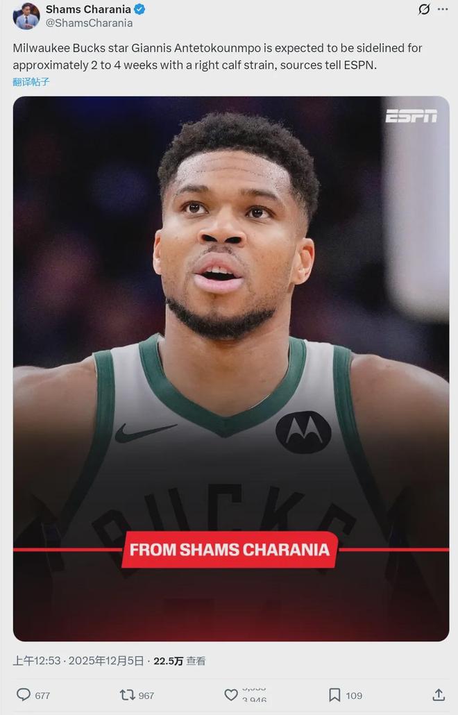 北京時間12月5日凌晨1點,據(jù)NBA名記Shams報道,字母哥右小腿拉傷,預計將休戰(zhàn)2-4周。在雄鹿和活塞的比賽中,開場3分鐘字母哥因傷退賽。中外球迷紛紛表示:雄鹿這是對字母哥進行交易保護,害怕他在交易之前再次受傷。