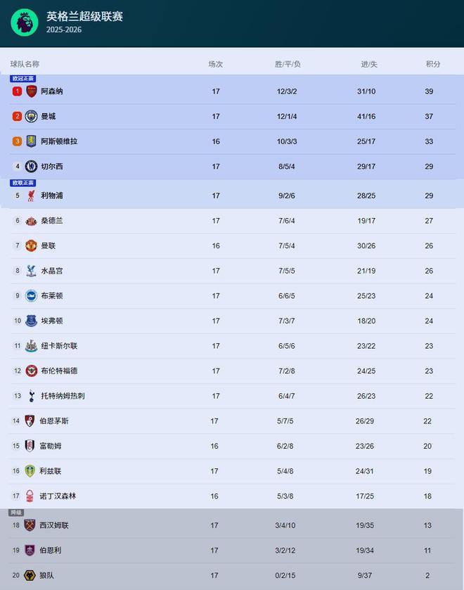 阿森納客場1-0戰(zhàn)勝了埃弗頓,英超聯(lián)賽積分39分。