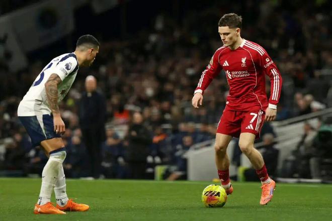 對陣熱刺的前20分鐘,看得出來斯洛特非常求穩(wěn),幾乎是丟失球權(quán)之后就全員退到本方半場進行陣地防守。熱刺最強的用球點是庫度斯,但他在邊路,陣眼位給了西蒙斯,但西蒙斯實在是有點菜,導(dǎo)致熱刺本身進攻也不那么好。